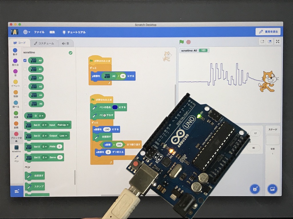 - Arduino専用ソフト「Scrattino」(Scratchベース)